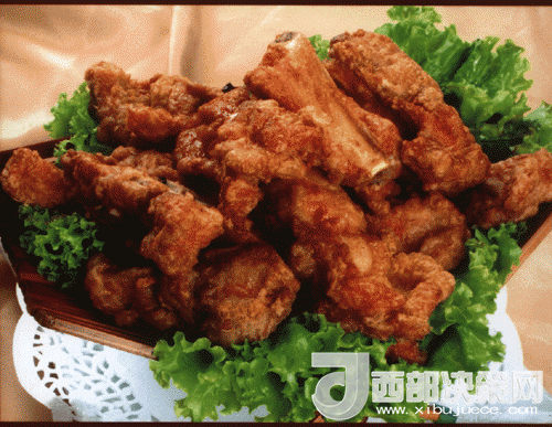 3、油燒到二成熱,把排骨放入鍋中,油溫由低至高慢慢炸制,至肋排成熟、外皮結(jié)殼取出瀝干油。