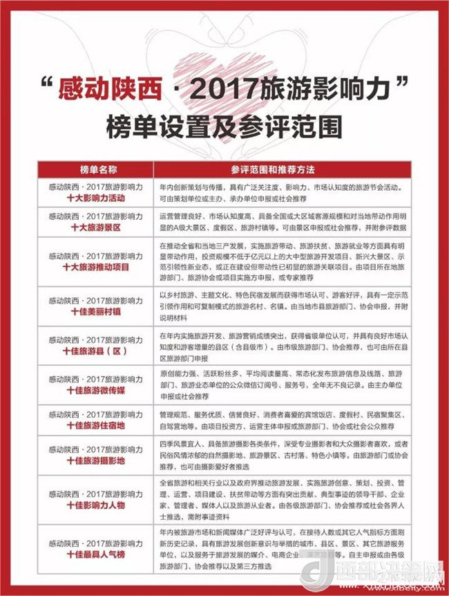 “感動(dòng)陜西·2017旅游影響力”大型評(píng)選活動(dòng),既是對(duì)2017年陜西旅游業(yè)的綜合評(píng)估和優(yōu)勢品牌項(xiàng)目的一次集中梳理和聯(lián)動(dòng)推廣,評(píng)選活動(dòng)設(shè)置了2017年“十大影響力活動(dòng)”、“十大旅游景區(qū)”、“十大旅游推動(dòng)力項(xiàng)目”、“十佳美麗村鎮(zhèn)”、“十佳旅游縣(區(qū))”、“十佳旅游微傳媒”、“十佳旅游住宿地”、“十佳旅游攝影地”、“十佳影響力人物”、“十佳最具人氣榜”10類項(xiàng)目,采取社會(huì)推薦、自主申報(bào)、專業(yè)推選、游客調(diào)查、網(wǎng)民評(píng)選、社會(huì)公示、大眾點(diǎn)評(píng)、數(shù)據(jù)分析等方法得出評(píng)選結(jié)果,于2018年1月通過大型盛典對(duì)外公布,使其成為載入史冊的2017年度陜西旅游業(yè)優(yōu)勢品牌榜單。