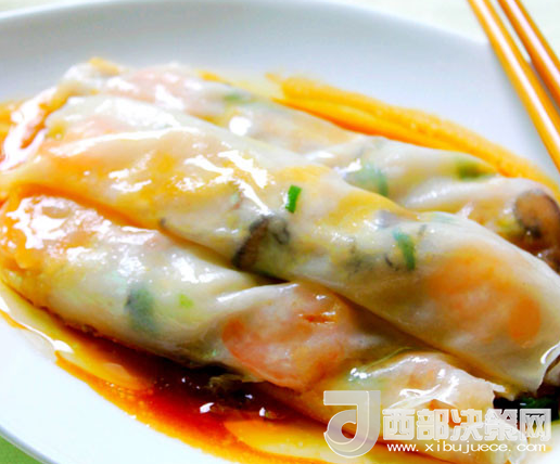 11.最后卷好,兩端切平整一點(diǎn)就可以裝盤(pán)。重復(fù)操作,很快就可以吃到自己做的鮮美腸粉了,醬料隨自己喜歡。