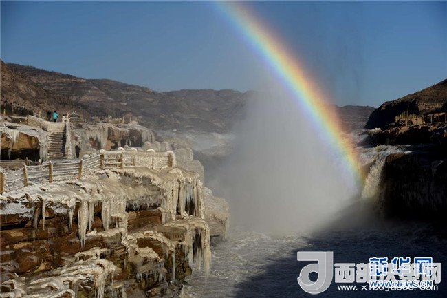 這是12月17日在山西吉縣黃河壺口瀑布拍攝的冰瀑彩虹景觀。當(dāng)日,黃河壺口瀑布出現(xiàn)彩虹景觀。壺口瀑布兩岸姿態(tài)萬千的冰瀑,與瀑布上空的彩虹相映成趣,美不勝收。(饒北成 攝)