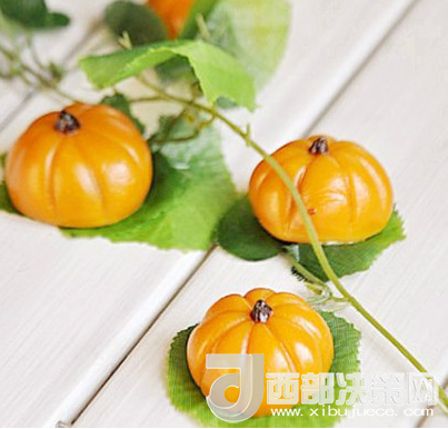 5、用刀背在圓球上按壓上一條溝。依次,在上面均分按壓四條;小南瓜就做好了,簡(jiǎn)單吧!