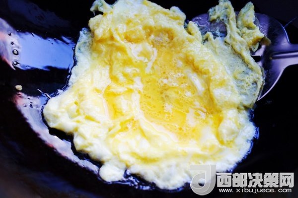 炒鍋里倒進油,燒熱后倒入雞蛋液炒蓬松。