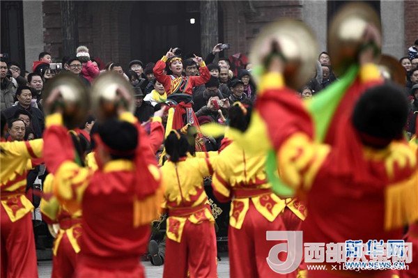 1月1日,在臺兒莊古城復興廣場,民間藝人在表演威風鑼鼓。(記者 郭緒雷 攝)