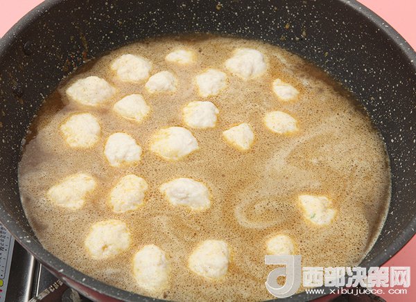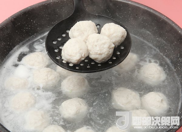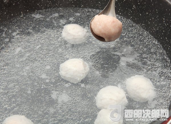 5、裝著魚(yú)丸的勺子在冷水鍋里輕輕抖一下,魚(yú)丸就自行脫落了。