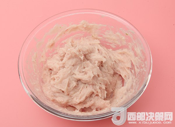 3、調(diào)入少許鹽、淀粉、蛋清攪拌均勻。然后加入水(比例大概魚(yú)3:水1),用筷子順著一個(gè)方向攪拌上勁。