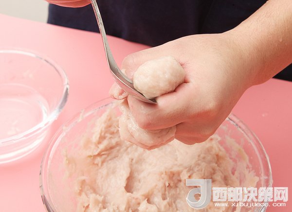 4、準(zhǔn)備一鍋冷水開(kāi)始擠魚(yú)丸,拇指先在虎口處滑一下,把魚(yú)茸磨平,這樣擠出來(lái)的魚(yú)丸就會(huì)光滑。然后往上擠,用另一只手拿勺子接一下魚(yú)丸。