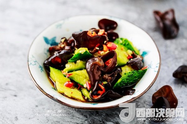 食材:黑木耳適量、精鹽1/4茶匙、黃瓜1根、白糖1/2茶匙、陳醋1茶匙、生抽1.5茶匙、紅辣椒適量。