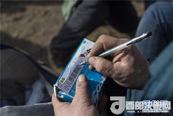 巡診隊醫(yī)生賽山在藥品上仔細用哈薩克語注明使用方法(2017年12月18日攝)。