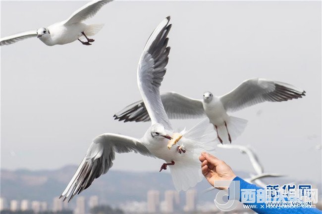 當日,云南省昆明市陽光明媚,眾多市民和游客來滇池海埂觀景大道觀賞、投喂紅嘴鷗。每年秋冬季大批紅嘴鷗飛臨昆明越冬。人鷗同樂成為昆明的一道風景線。記者胡超攝