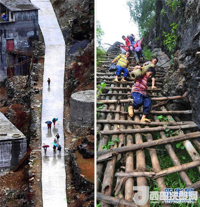 2012年9月3日,廣西大化瑤族自治縣板升鄉(xiāng)弄勇村弄頂屯的孩子們扛著生活用具去學校(右圖);2017年1月11日,水泥公路已經從學校修通到家門口(左圖)。隨著脫貧攻堅工作不斷推進,原本“千重山,萬層嶺,不通水,不通電”的廣西大石山區(qū)發(fā)生了翻天覆地的變化。記者黃孝邦攝