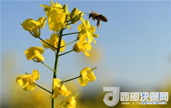 一只蜜蜂在云南省羅平縣盛開的油菜花旁準(zhǔn)備采蜜(2月28日攝)。新華社記者 藺以光 攝