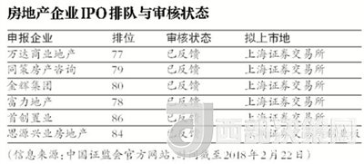 據(jù)中國證監(jiān)會最新公布的《發(fā)行監(jiān)管部首次公開發(fā)行股票審核工作流程及申請企業(yè)情況》顯示,截至2018年2月22日,證監(jiān)會受理首發(fā)企業(yè)438家,其中,已過會27家,未過會411家。未過會企業(yè)中正常待審企業(yè)404家,中止審查企業(yè)7家。其中,在“涉房”企業(yè)中萬達(dá)商業(yè)地產(chǎn)、富力地產(chǎn)、同策房產(chǎn)咨詢、金輝集團(tuán)、首創(chuàng)置業(yè)等繼續(xù)保持“已反饋”狀態(tài)。按照申報企業(yè)排序,分別位列77、78、79、80、86名。