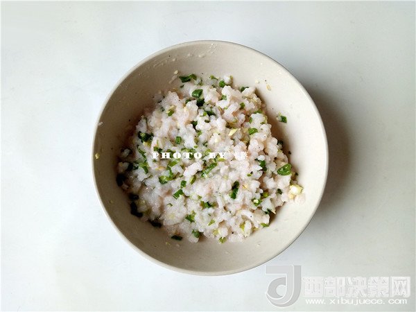 3.蝦仁里調(diào)入鹽,料酒,白胡椒粉,淀粉,攪拌均勻;再同姜末,蔥末混合,攪拌均勻;蔥末需留部分待用;