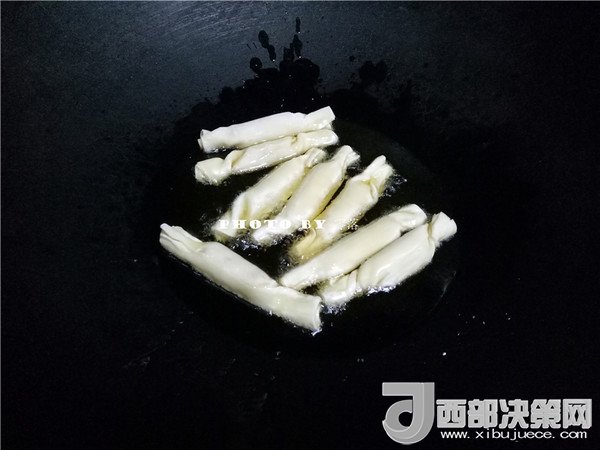 8.炒鍋里倒入稍微多一點(diǎn)的植物油;油鍋燒熱,轉(zhuǎn)小火;放入“糖果”炸至金黃;