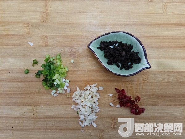 輔料:豆豉 1茶匙   大蒜 3瓣   生抽 1茶匙   小蔥 2棵   姜絲 5克   干辣椒 2個(gè)