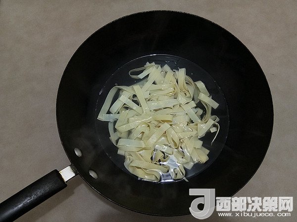 4.切好的千張放入沸水中焯一下水,去除豆腥味。