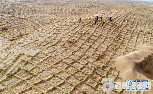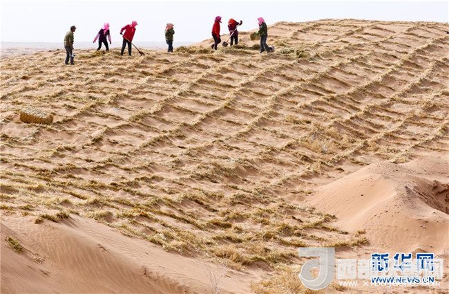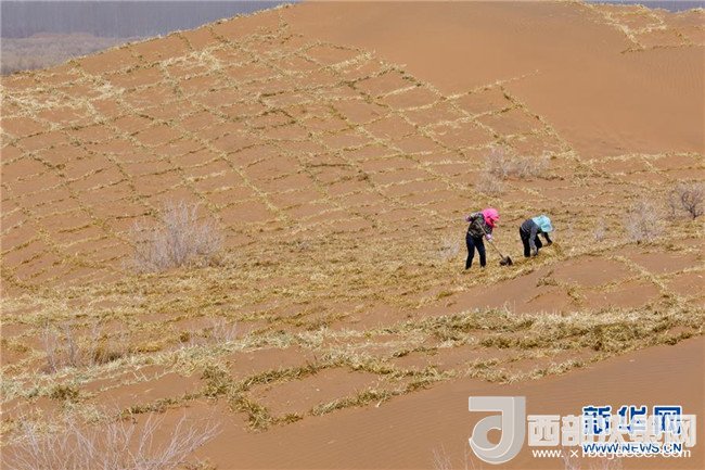 3月27日,在臨澤縣北部干旱荒漠區(qū),人們用麥草筑牢阻沙網(wǎng)。甘肅省臨澤縣位于巴丹吉林沙漠邊緣,沙漠戈壁面積占全縣總面積三分之二以上。連年來(lái),臨澤縣持續(xù)防沙治沙,筑牢生態(tài)安全屏障,目前已建成防風(fēng)固沙林27.1萬(wàn)畝,阻沙林帶187公里,封育荒漠植被50萬(wàn)畝。新華社發(fā)(王將攝)