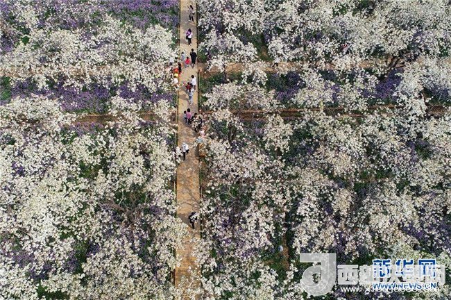 清明時節(jié),在江蘇省宿遷市三臺山森林公園梨香滿園景區(qū),白色的梨花和紫色的二月蘭爭相綻放,吸引眾多游客前來踏青賞花。 新華社發(fā)(周國強 攝)