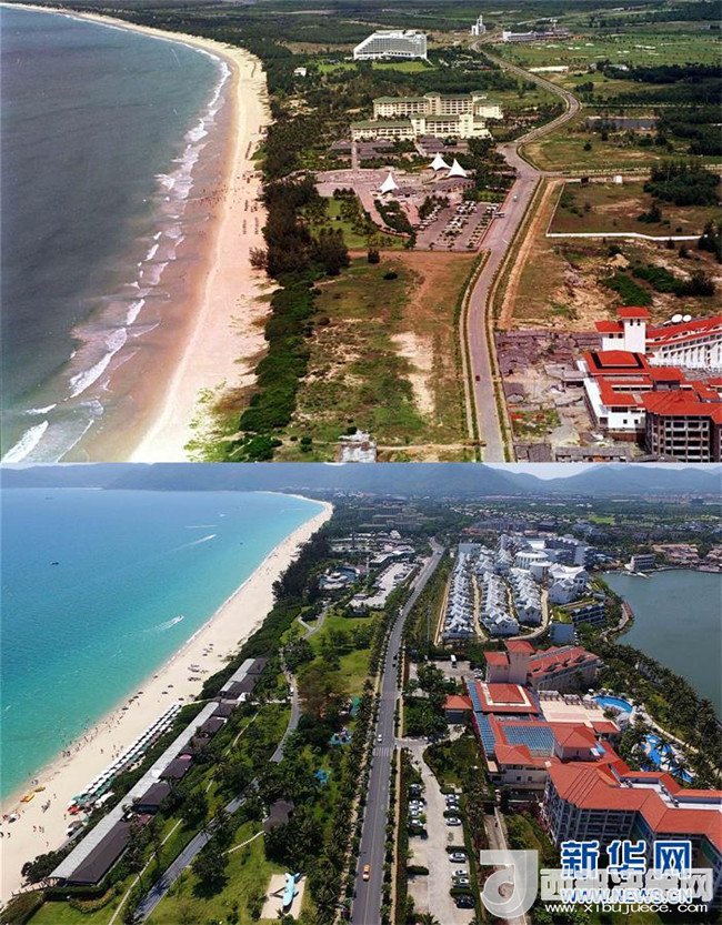 拼版照片為三亞市亞龍灣今昔對(duì)比(上圖為1998年新華社記者姜恩宇攝,下圖為2018年4月4日新華社記者郭程攝)。