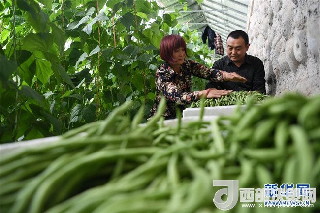 4月18日,甘肅省酒泉市肅州區(qū)總寨鎮(zhèn)總寨村村民范立德(后)和妻子在日光溫室內(nèi)采摘蔬菜。