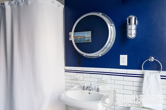 衛(wèi)浴間選擇深藍(lán)色與白色搭配,墻面中間位置用藍(lán)色條紋腰線來(lái)裝飾,頗有海軍風(fēng)的味道,干凈清爽。