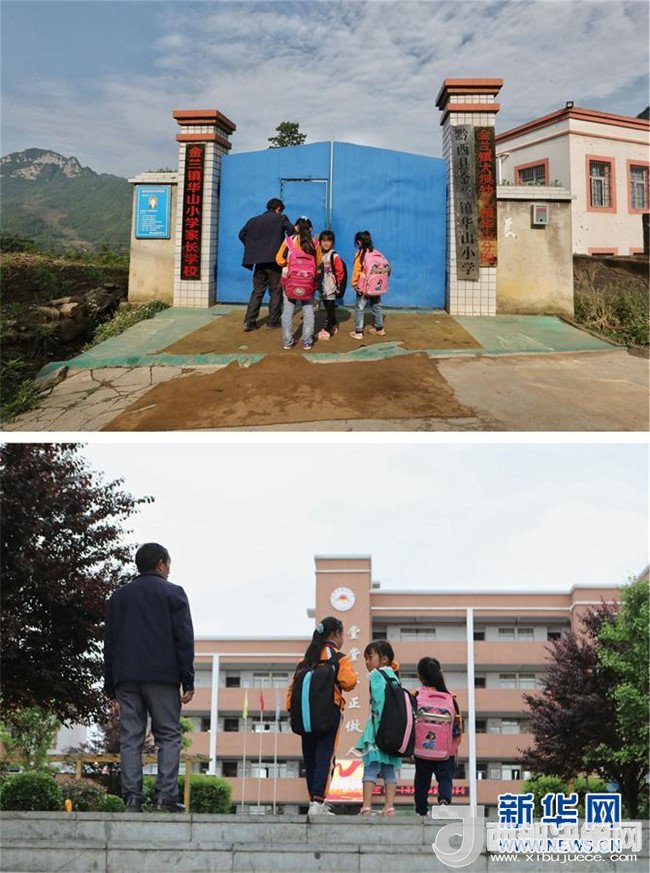 拼版照片:上圖為教師楊紹書和學(xué)生們經(jīng)過約2個小時的艱難跋涉到達華山小學(xué)(4月27日攝);下圖為教師楊紹書和學(xué)生們經(jīng)過20多分鐘的公路行走,到達黔西縣第十小學(xué)(5月7日攝)。