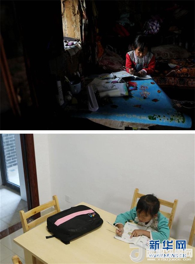 拼版照片:上圖為7歲的李曉彤在哈沖組的舊居內(nèi)做作業(yè)(4月27日攝);下圖為7歲的李曉彤在錦繡花都安置點新居內(nèi)做作業(yè)(5月7日攝)。
