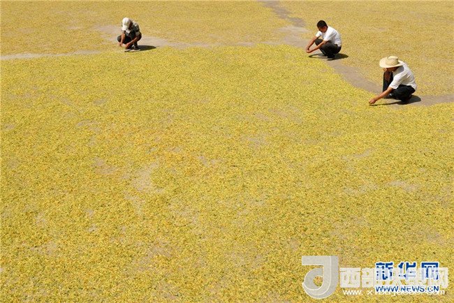 5月27日,河北省吳橋縣鐵城鎮(zhèn)雙井王村農(nóng)民晾曬金銀花。