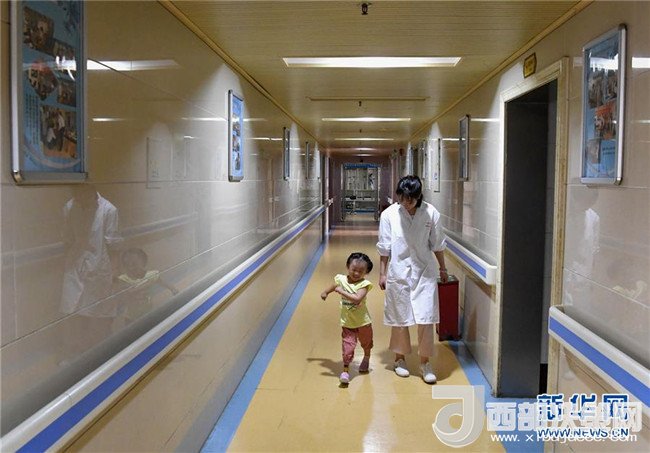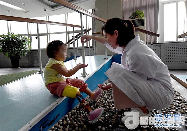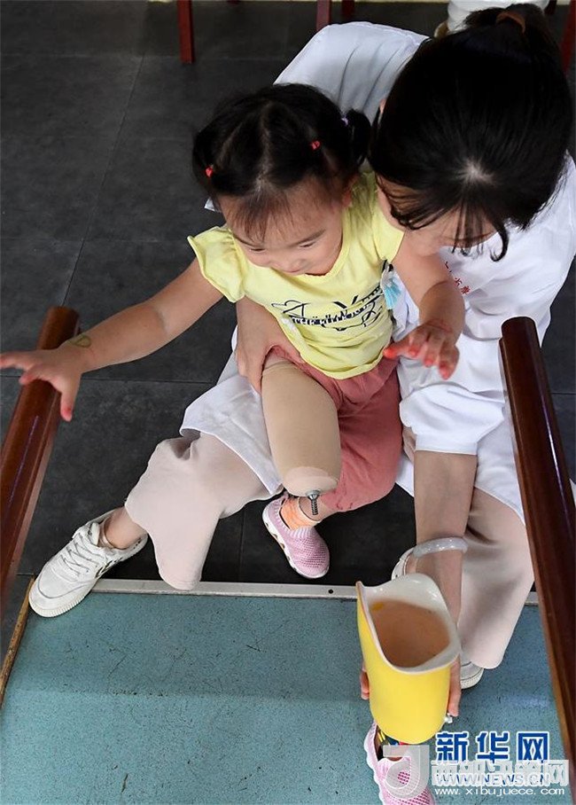 5月29日,笑笑在假肢康復(fù)訓(xùn)練指導(dǎo)師袁紫薇的陪護(hù)下練習(xí)獨立行走。