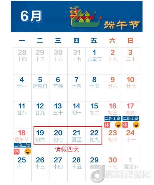 今年端午節(jié)放假時間為6月16日至18日,共計3天。中新經(jīng)緯客戶端注意到,只要能在19日-22日請假4天,端午節(jié)便可連休9天。