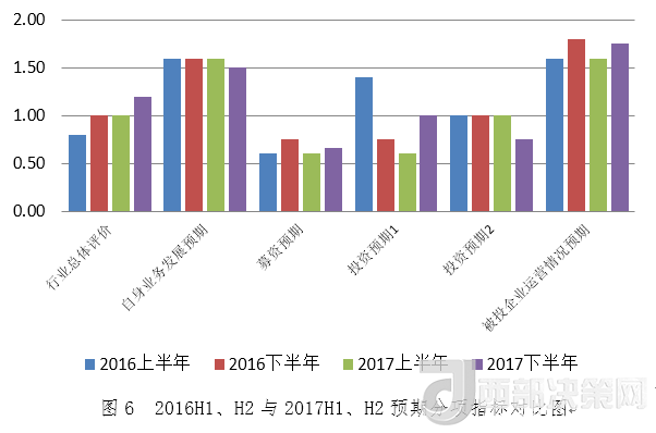 相較于募資、投資、退出指標(biāo)的微降,機(jī)構(gòu)信心指標(biāo)上漲顯示投資人對2018年北京地區(qū)股權(quán)投資發(fā)展充滿了信心。從預(yù)期分項(xiàng)指標(biāo)看,雖然指標(biāo)所處水平顯示投資人認(rèn)為2018年上半年行業(yè)總體仍將保持平穩(wěn)發(fā)展態(tài)勢,對自身業(yè)務(wù)發(fā)展預(yù)期、募資預(yù)期、投資預(yù)期保持中性,但是行業(yè)總體評價、被投企業(yè)運(yùn)營情況預(yù)期、募資預(yù)期、投資預(yù)期這四個指標(biāo)均較上期有所增長,而自身業(yè)務(wù)發(fā)展預(yù)期指標(biāo)和投資預(yù)期指標(biāo)較上期有所下降,綜合顯示投資人對行業(yè)和自身業(yè)務(wù)發(fā)展謹(jǐn)慎樂觀的態(tài)度。
