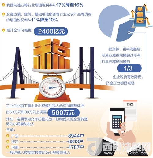 從5月1日起,我國(guó)制造業(yè)等行業(yè)增值稅稅率從17%降至16%,交通運(yùn)輸、建筑、基礎(chǔ)電信服務(wù)等行業(yè)及農(nóng)產(chǎn)品等貨物的增值稅稅率從11%降至10%,預(yù)計(jì)全年可減稅2400億元。