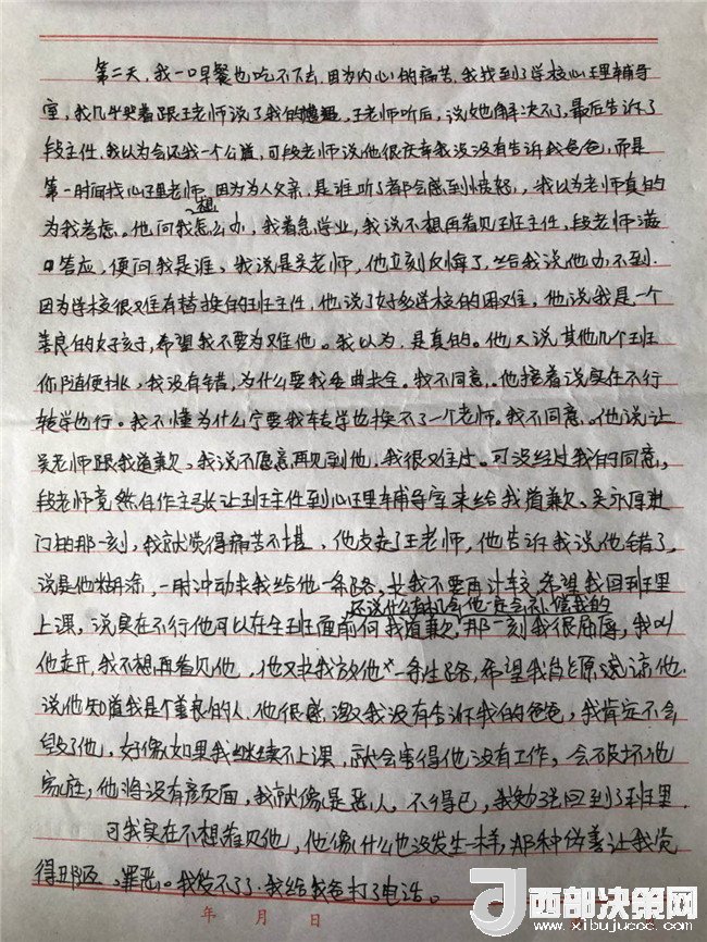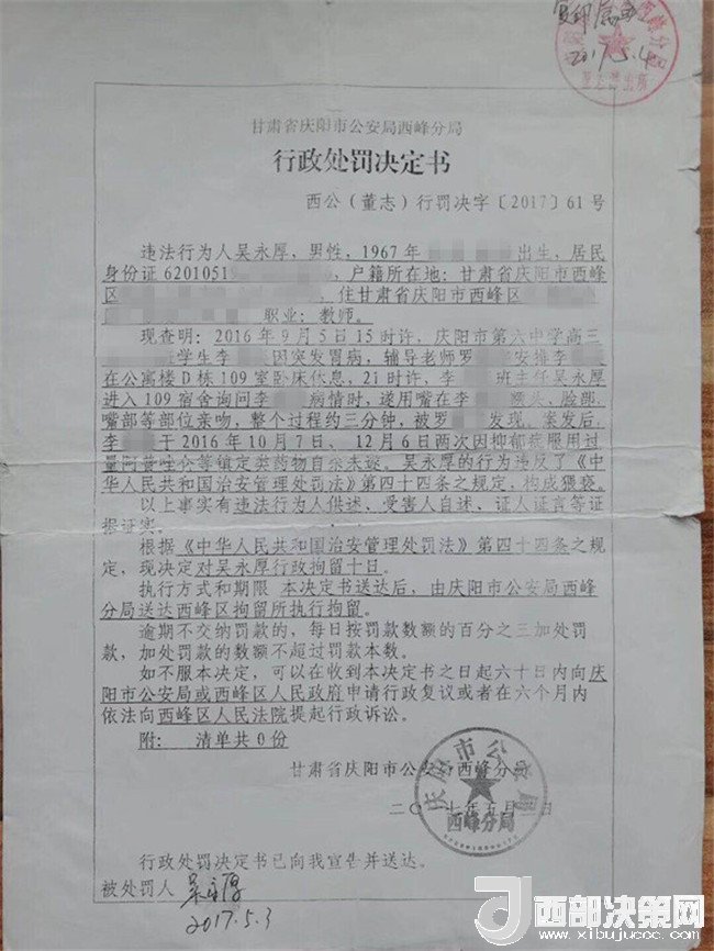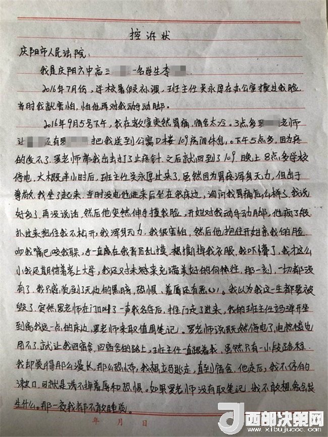 孩子叫李某奕,1999年4月出生,原慶陽(yáng)六中高三(二)班學(xué)生,平時(shí)活潑開朗,勤奮好學(xué),成績(jī)?cè)诎嗉?jí)前列。然而,噩夢(mèng)從2016年9月開始了。2016年9月5日下午,當(dāng)時(shí)正在慶陽(yáng)六中讀高三的李某奕突然胃疼,因?yàn)樗奚岜容^冷,被老師安排在教師公寓休息。晚上8點(diǎn)半左右,班主任吳某厚以探病為由進(jìn)入女兒休息的房間,詢問(wèn)過(guò)后便開始摸臉、親吻、咬耳朵、摟抱李某奕,后因安排她休息的老師進(jìn)房間取東西才停止。此后她心里就有了陰影。她先找到學(xué)校心理輔導(dǎo)老師哭訴了自己的遭遇,心理輔導(dǎo)老師解決不了,又告訴了政教主任段老師。交談中段主任得知孩子的訴求是不想見到這位涉事老師,就答應(yīng)其要求。并肯定了孩子沒(méi)告訴家長(zhǎng)是對(duì)的。