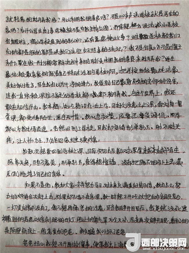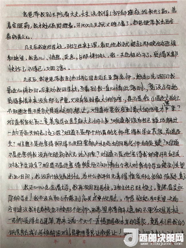 孩子的病情一直不見好轉(zhuǎn),主治醫(yī)生和心理輔導(dǎo)老師都說(shuō)要打開孩子的心結(jié),而孩子的心結(jié)就在學(xué)校一直沒(méi)有給她一個(gè)公正的說(shuō)法。在斷斷續(xù)續(xù)上學(xué)過(guò)程中,他多次找過(guò)學(xué)校。起初學(xué)校還和他談,后來(lái)學(xué)校說(shuō)他們是組織教學(xué)的地方,處理教師的事管不了,要找教育局,直接就不理他了。再后來(lái)他連門都進(jìn)不去了。