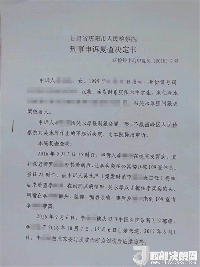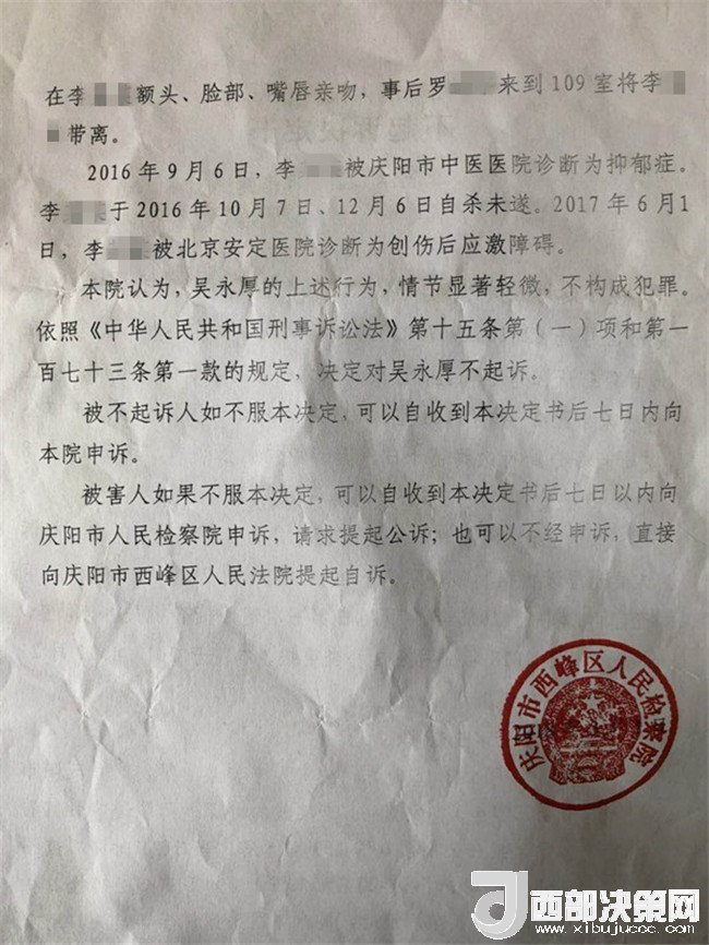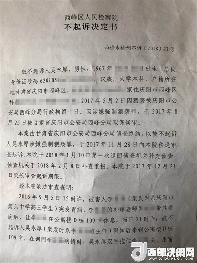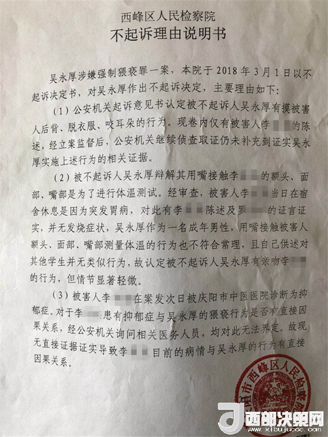 2017年2月26日,李某奕在父親陪同下到公安機(jī)關(guān)報(bào)案,稱被其班主任吳某厚猥褻,要求查處。經(jīng)辦案部門調(diào)查,2017年5月2日,公安機(jī)關(guān)依據(jù)《中華人民共和國(guó)治安管理處罰法》第四十四條之規(guī)定,以猥褻行為對(duì)吳某厚處以行政拘留十日處罰。其間,李某奕父親認(rèn)為公安局處罰不當(dāng),到西峰區(qū)人民檢察院進(jìn)行申訴。區(qū)檢察院調(diào)閱案卷后認(rèn)為吳某厚的行為涉嫌犯罪,書面通知公安局立案?jìng)刹?。公安局?017年8月10日立為刑事案件。8月25日對(duì)吳某厚采取取保候?qū)彺胧?1月20日偵查終結(jié)后移送起訴至區(qū)檢察院。區(qū)檢察院審查后認(rèn)為吳某厚的行為“情節(jié)顯著輕微,不構(gòu)成犯罪”,“決定對(duì)吳某厚不起訴”,并出具《不起訴理由說(shuō)明書》。提出不起訴的三個(gè)理由,包括“公安機(jī)關(guān)繼續(xù)偵查取證仍未補(bǔ)充到吳某厚實(shí)施上述行為的相關(guān)證據(jù)”、“吳某厚有親吻李某奕的行為,但情節(jié)顯著輕微”、“無(wú)直接證據(jù)證實(shí)導(dǎo)致李某奕目前的病情與吳某厚的行為有直接因果關(guān)系”,于2018年3月1日作出不起訴決定。李某奕遂到慶陽(yáng)市人民檢察院進(jìn)行申訴。5月18日,市檢察院維持區(qū)檢察院不起訴決定。6月25日晚,據(jù)李某奕父親講,他已將申訴材料寄至甘肅省人民檢察院。