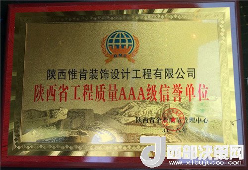西部決策網(wǎng)——西部大開發(fā)訊(帥華鋒 張曉紅)近日,寶雞市惟肯裝飾榮獲陜西省企業(yè)質量管理中心頒發(fā)《陜西省工程質量AAA級信譽單位》和《陜西省誠信經(jīng)營重點推薦單位》兩項榮譽稱號。