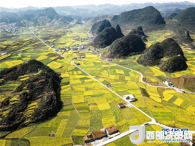 六盤(pán)水市六枝特區(qū)木崗鎮(zhèn)的油菜花田(3月9日無(wú)人機(jī)拍攝)。