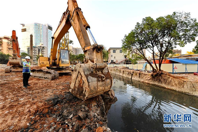 福建省福州市鼓臺中心區(qū)水系綜合治理點達(dá)道河河長溫水林在指揮工人進(jìn)行河道新建截污管的回填(2017年10月11日攝)。
