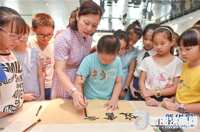 7月24日,在福建省少年兒童圖書館,省級(jí)書法名師、福州市烏山小學(xué)校長(zhǎng)方曉敏在指導(dǎo)小營(yíng)員們習(xí)字。