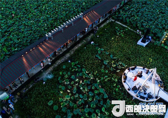 樂隊組合在浙江省建德市大慈巖鎮(zhèn)里葉村荷田間的舞臺上進行演奏(7月14日無人機拍攝)。新華社記者 徐昱 攝