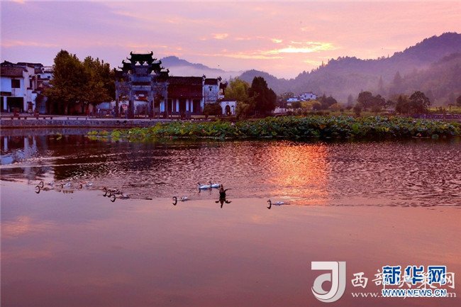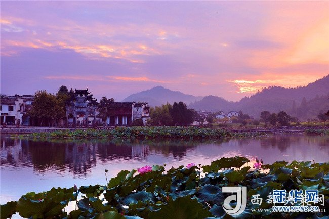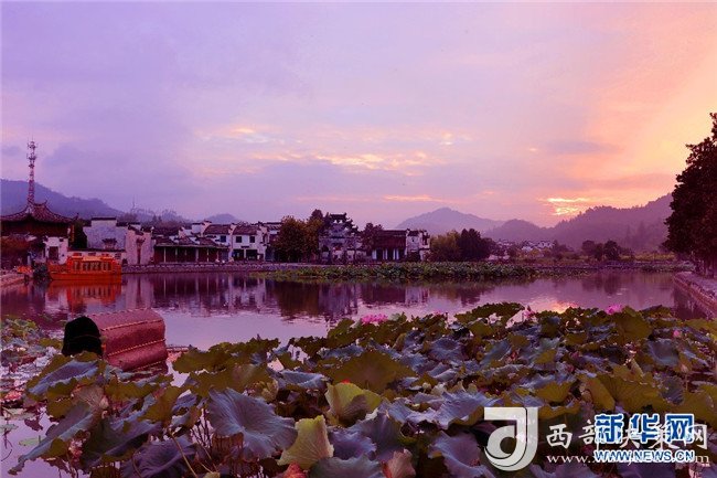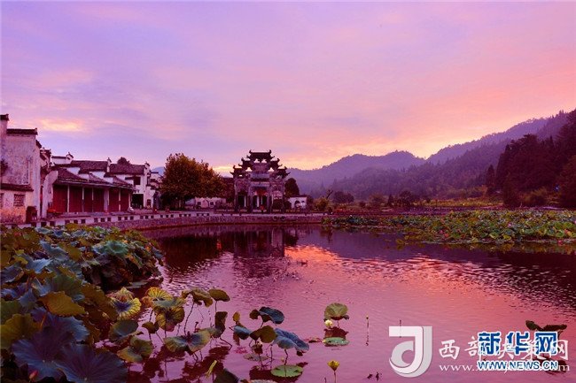 漫天朝霞映古村 半湖荷影入畫來