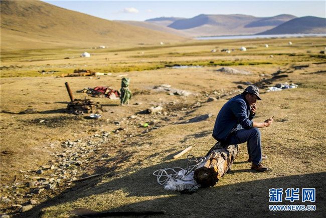 在青河縣查干郭勒鄉(xiāng)薩爾布拉克村,胡賽因·哈力都拉在牧場上用手機(jī)上網(wǎng)(8月23日攝)。新華社記者江文耀攝