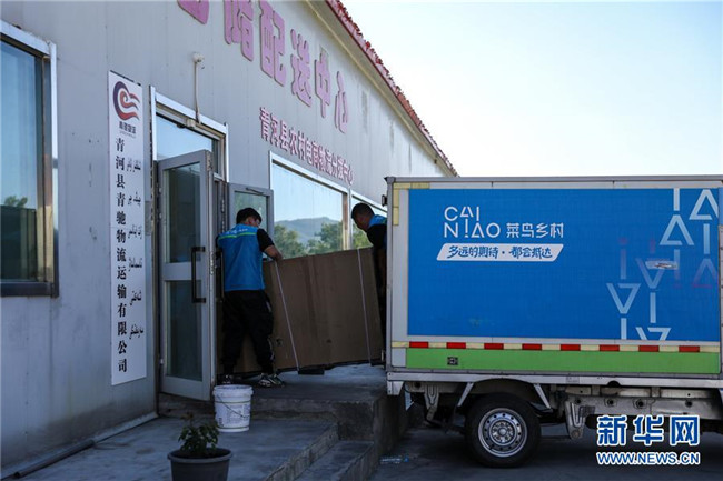快遞員從青河縣農(nóng)村電商物流分撥中心將網(wǎng)購的摩托車運(yùn)上快遞車(8月24日攝)。新華社記者江文耀攝