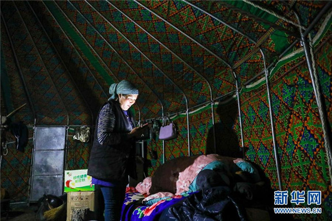 在青河縣查干郭勒鄉(xiāng)薩爾布拉克村,胡賽因·哈力都拉的妻子巴提古麗·朱馬江在氈房里準(zhǔn)備給手機(jī)充電(8月25日攝)。新華社記者江文耀攝