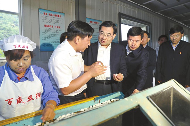9月13日,省委書記胡和平深入商洛市鎮(zhèn)安縣調(diào)研脫貧攻堅(jiān)工作。圖為在百盛繅絲廠,胡和平了解選繭、繅絲等生產(chǎn)流程,聽取公司生產(chǎn)經(jīng)營和脫貧幫扶情況介紹。 記者 宋紅梅攝