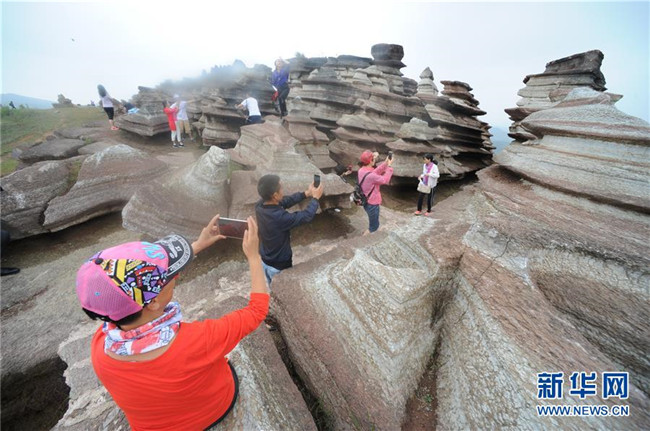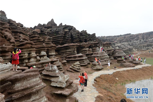 貴州省松桃苗族自治縣盤(pán)石鎮(zhèn)的紅石林景區(qū)山石奇特,吸引眾多游人。 新華社記者 楊楹 攝