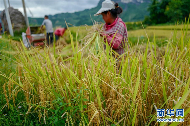 9月19日,花田鄉(xiāng)何家?guī)r村村民在收獲稻米。記者劉潺攝