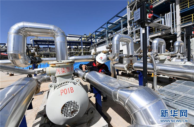 延安煤油氣資源綜合利用項目甲醇制烯烴中心的工作人員在進行設(shè)備巡檢(9月28日攝)。新華社記者 劉瀟 攝