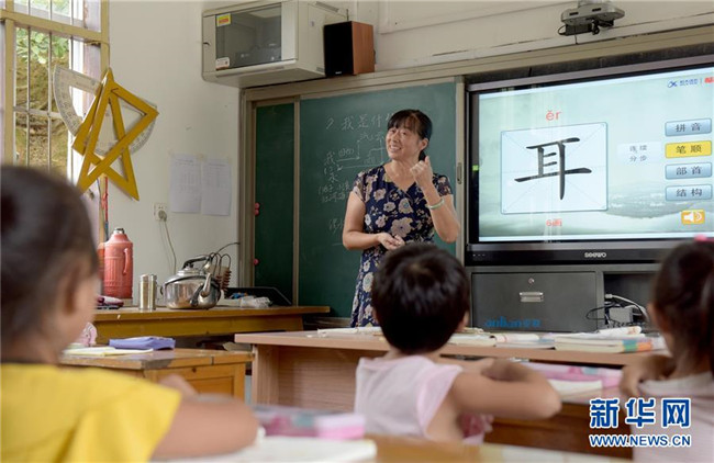 在安徽省黃山市黃山區(qū)烏石鎮(zhèn)清溪中心小學(xué)茶兒垅村教學(xué)點(diǎn)內(nèi),蔣秀蘭老師在給孩子們上語文課(9月7日攝)。今年53歲蔣秀蘭老師從1983年參加工作開始,一直獨(dú)自堅守在“一人一校”的單班教學(xué)點(diǎn),最多的時候獨(dú)自一人帶過26名學(xué)生,目前她負(fù)責(zé)兩個年級5個孩子7門課的教學(xué)。  新華社記者 王正忠 攝
