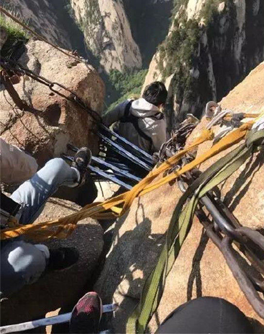 鷂子翻身:這條據(jù)說坡度在120度的懸崖峭壁主要靠臂力,只能用手抓著鐵鏈,腳摸索著探路。人是從上往下攀緣,崖壁往里傾,從上往下望,只有云,只有山峰,什么都不見。這里的可怕在于你不知腳下的路,更無法預(yù)知危險(xiǎn),一不留神就會(huì)兩腳懸空,被保險(xiǎn)繩吊在空中。